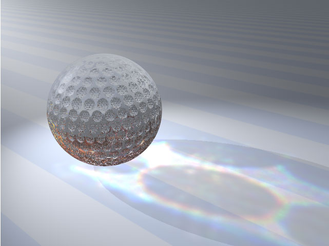 Using the XL7 Demo on a 1.37GB G4/450 with OS9.1. Crystal Golf ball with surface caustics. R,G&B caustics rendered separately and composited in AfterEffects. The spectral coloring gives it a little more realism. The technique is to render 3 times, once for Red, Green and Blue. The light is set to the 100% color for each render, and the refractive index is changed. In this case, I used values between 1.5 and 2.5. The resulting 3 images are composited in AE using "Add" transfer mode. They can also be combined in Photoshop using inverse multiply (also called "Screen") transfer mode. Other experiments with XL7 caustics are here.